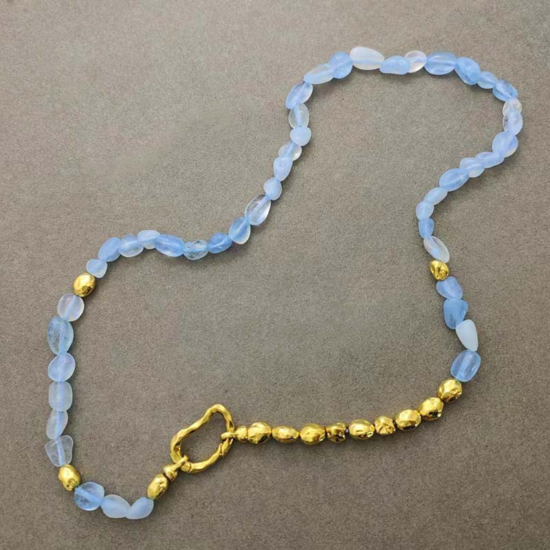 Natural Aquamarine Necklace with European and American Gold Stitching Bracelet, Vacuum Copper Gold-Plated, Fashionable and Elegant Beaded Hexagon