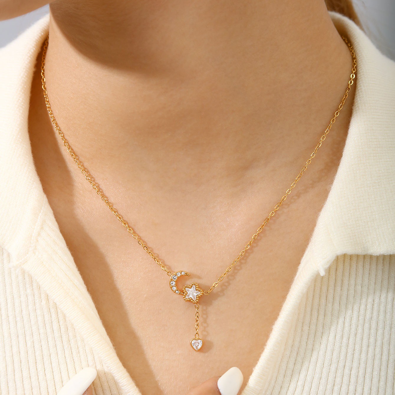 Elegant, Fashionable, Luxurious and High-End Star and Moon Heart Pendant Inlaid with Zircon Stainless Steel Plated with 18K Gold for Women