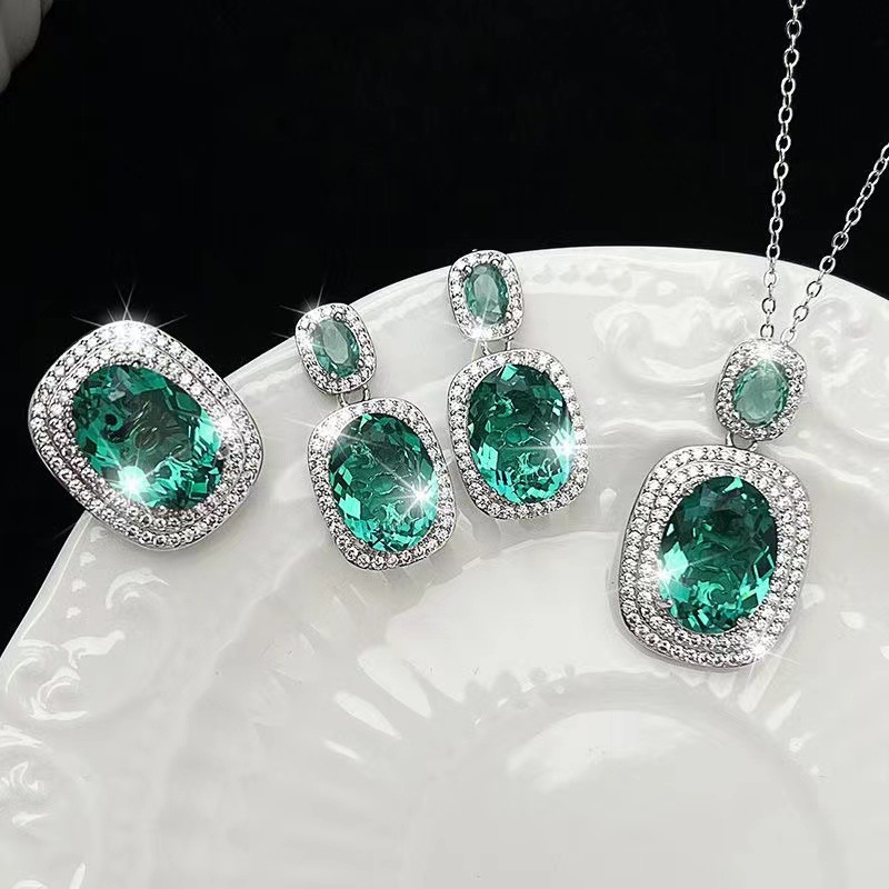 Cross-border New Jewelry European and American Luxury Color Treasure suit Ancestor Diamond Necklace Green Crystal Earrings Combination Necklace Women's All-match