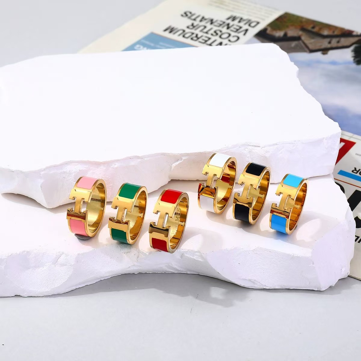 Cross-Border Korean Style Light Luxury H Letter 18K Gold-Plated Ring with Red Enamel for Women, Adjustable Open Ring