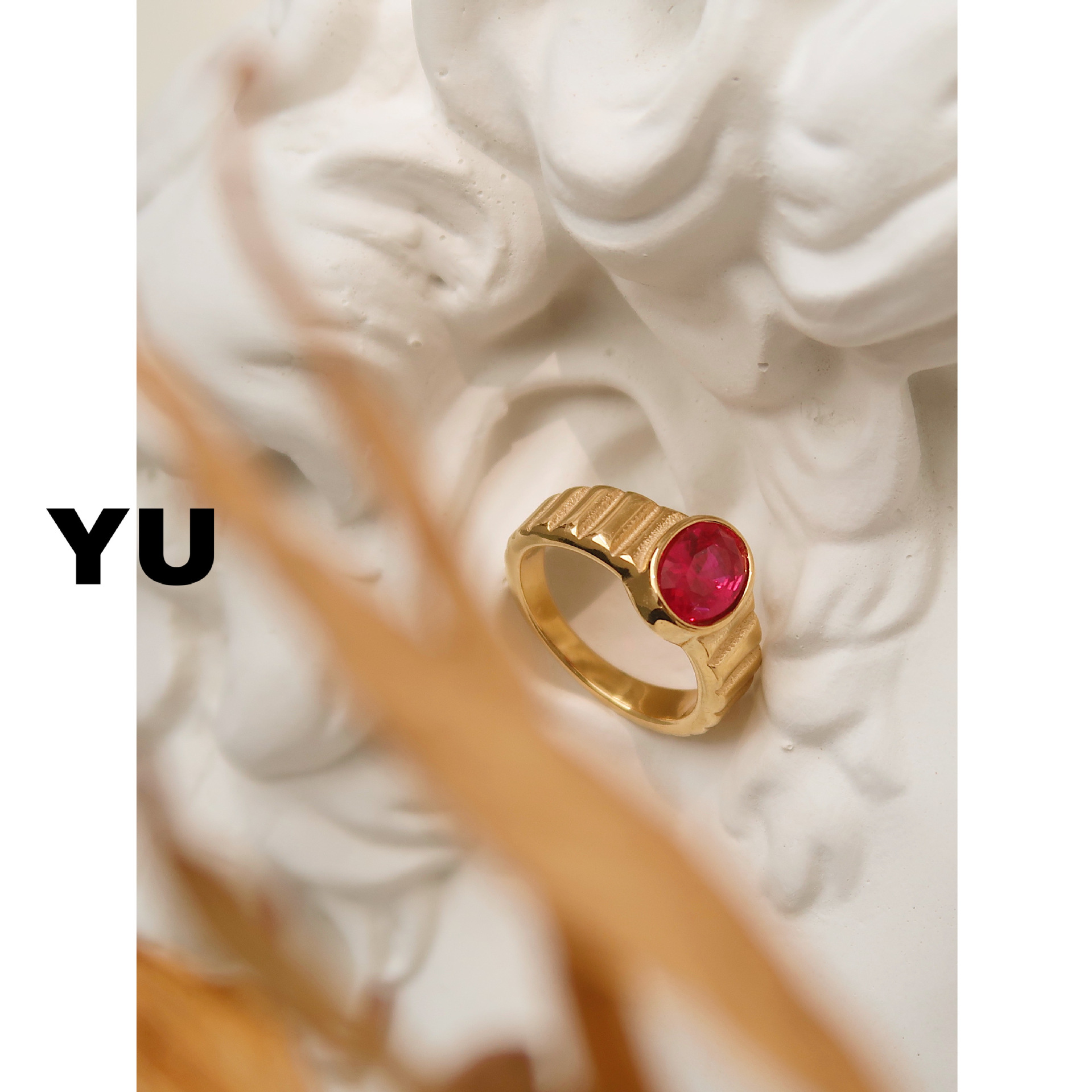 With Yu Jewelry Ruby Ring Zircon Ring Temperament Fashion French European and American Titanium Steel Gold Plated Retro Style ins