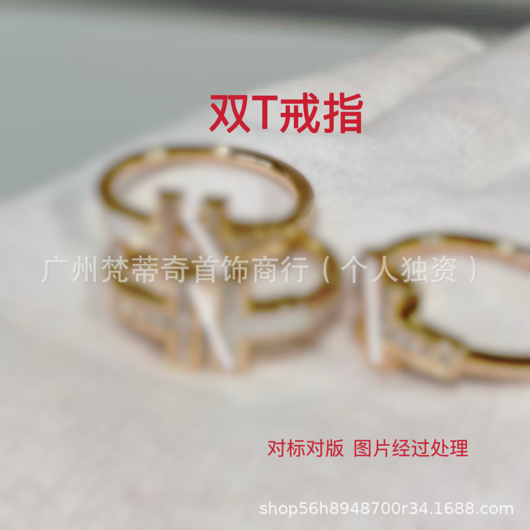 T Brand High-Quality V Gold White Mother-Of-Pearl Diamond-Studded Double t Ring for Women, Light Luxury, Sophisticated, Versatile Classic Model, Popular on Live Broadcasts