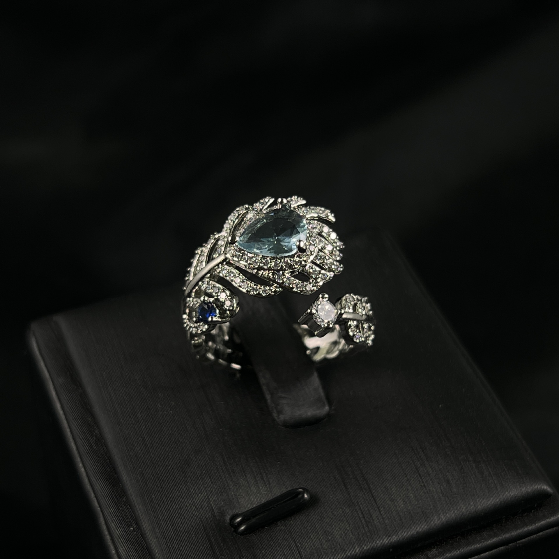 Light Luxury Fashion Jewelry Sky Blue Elegant Feather Ring High Niche Design Ring Copper Gold Plated Opening