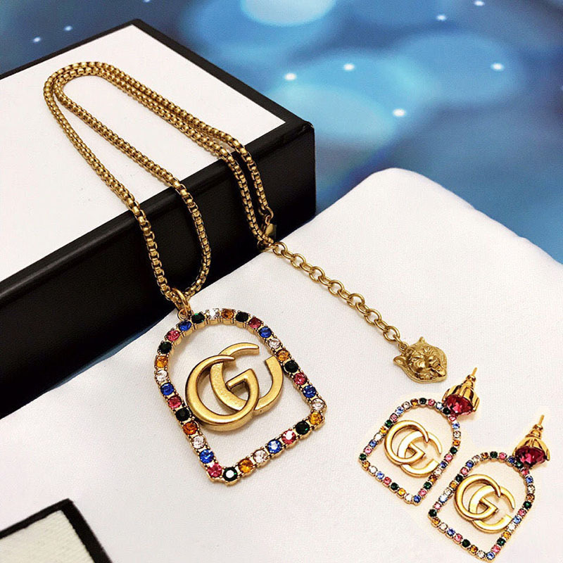 G Home/Gugujia 2020 New Retro Color Diamond Square Necklace Women's Double g Internet Celebrity Temperament Women's Personalized Earrings