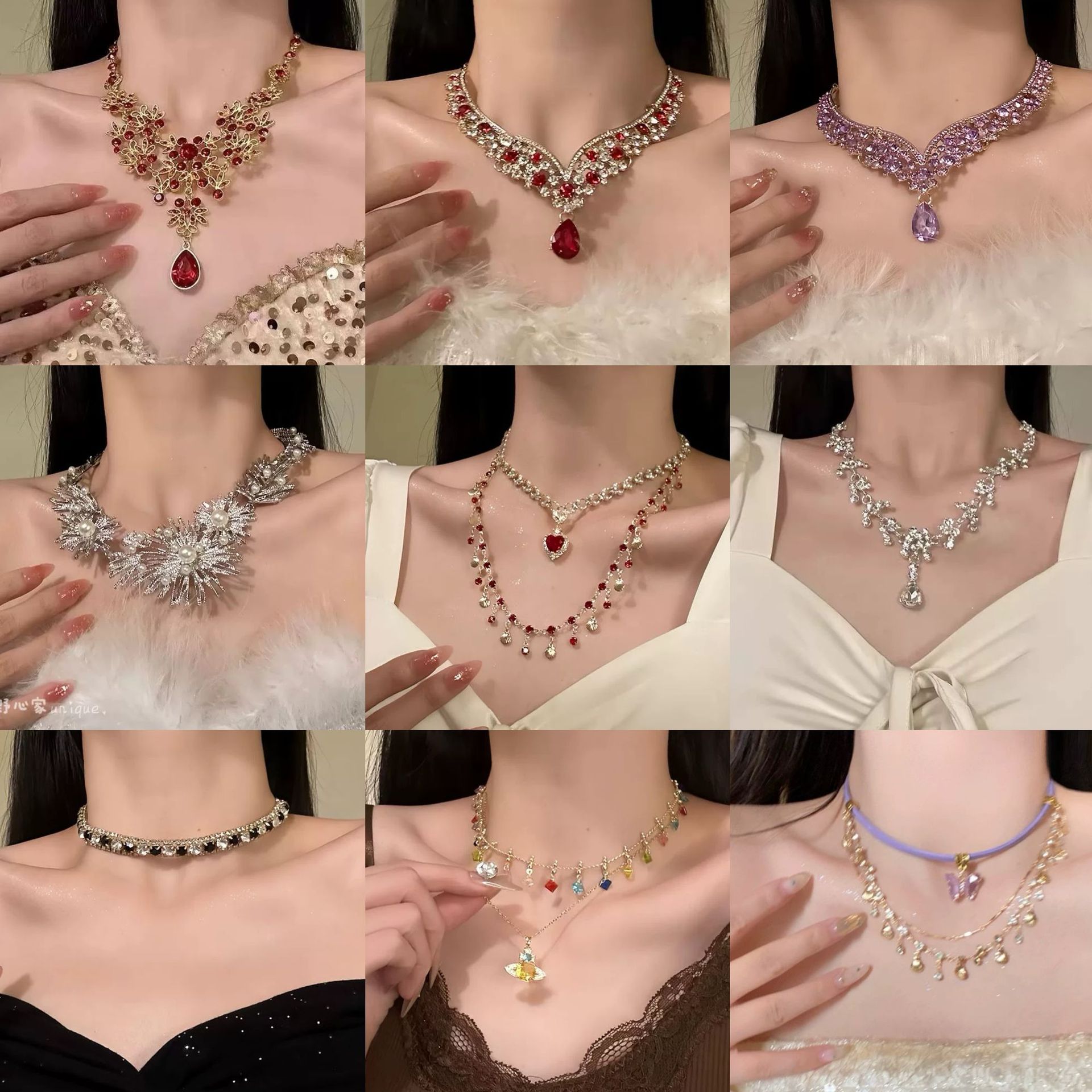 New Chinese Style Light Luxury Sparkling Rose Red Corundum Passepartout Dual-Use Necklace High-End Three-Row Diamond Ruby Ring for Women