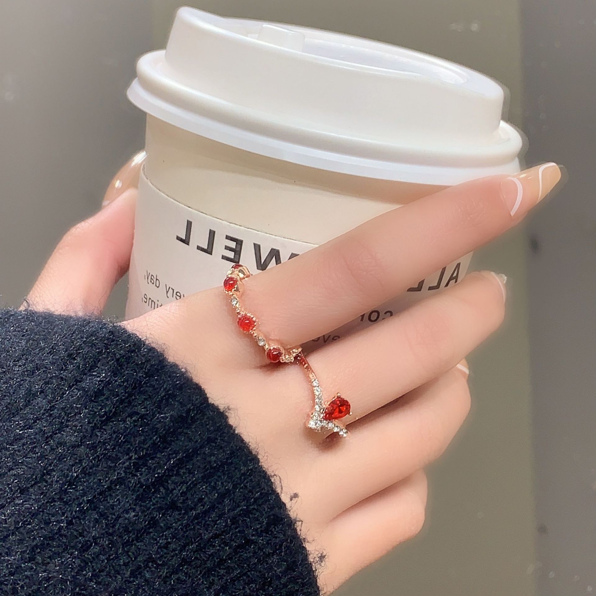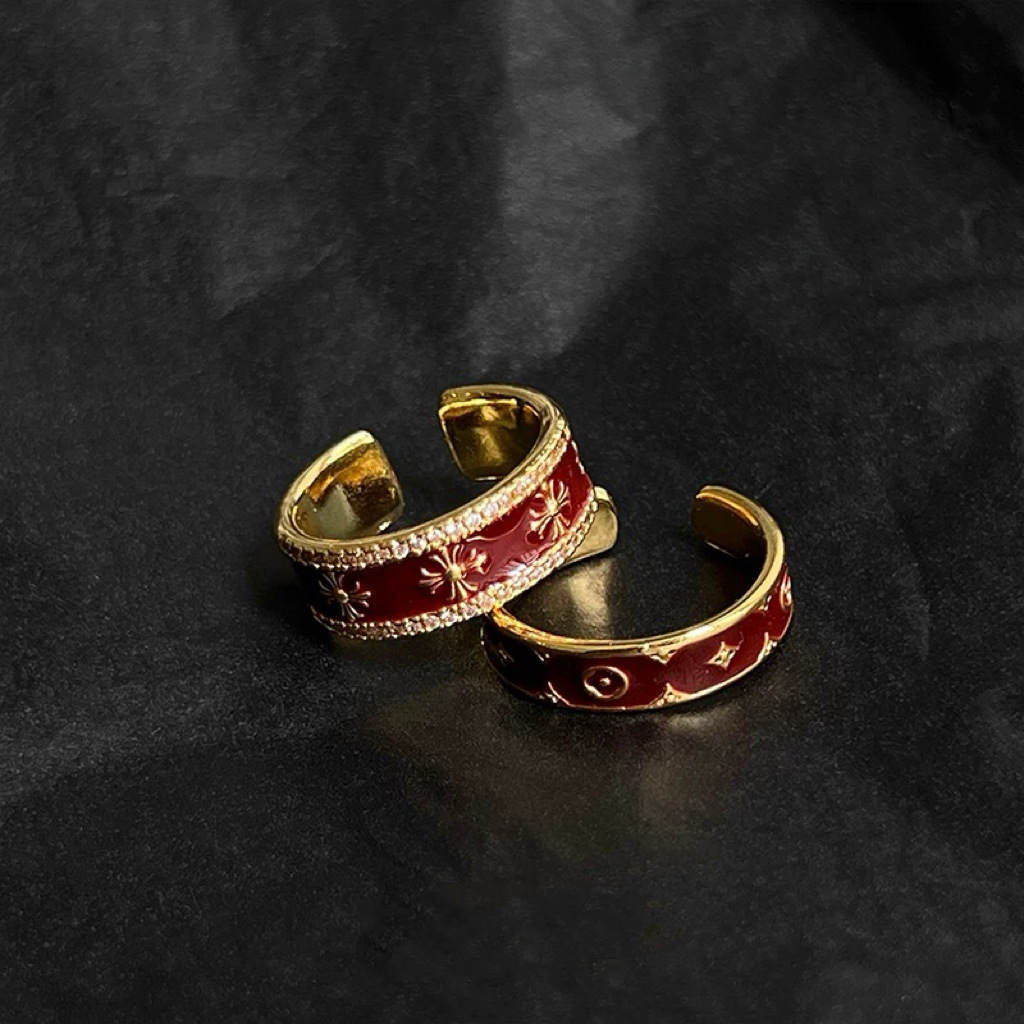 Cross-Border Korean Style Light Luxury H Letter 18K Gold-Plated Ring with Red Enamel for Women, Adjustable Open Ring