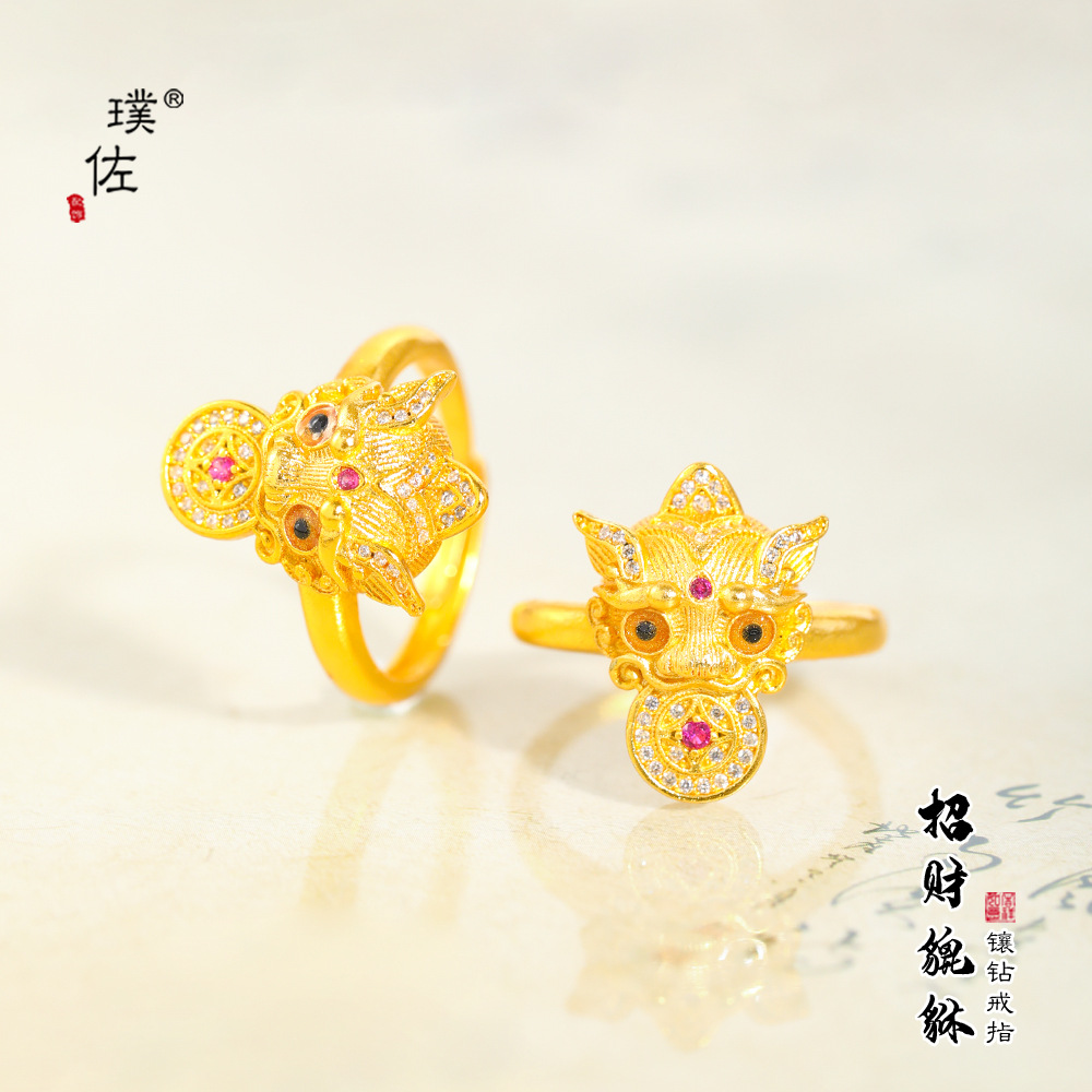 Puzuo Gold Shop's Same Style Sand Gold Brushed Diamond Lucky Pixiu Ring New Chinese Style Wealth-Gathering Index Finger Ring for Women