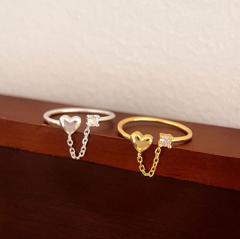 Fashion Entry Luxury Niche Design High-grade Love Tassel Ring Female Zircon Chain Heart-shaped Ring Opening Jewelry