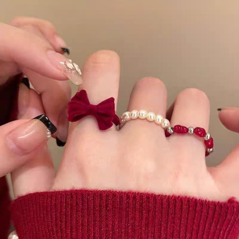 Vintage Flocking Autumn and Winter Red Bow Pearl Beaded Ring Sweet High Sense Design Index Finger Ring Women