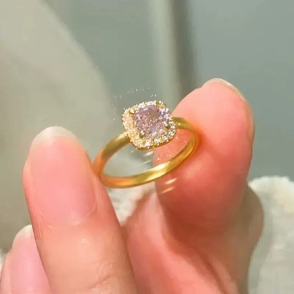Square Diamond Zircon Ring Pink Zirconium Light Luxury Niche High-End Simple and Stylish Versatile Ring Copper Gold-Plated
