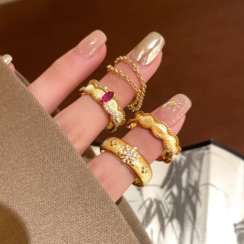 Double-Layer Stacked Imitation Ruby Ring for Women, Retro Brushed Ring, Elegant and High-End Plain Chain Gold Index Finger Ring