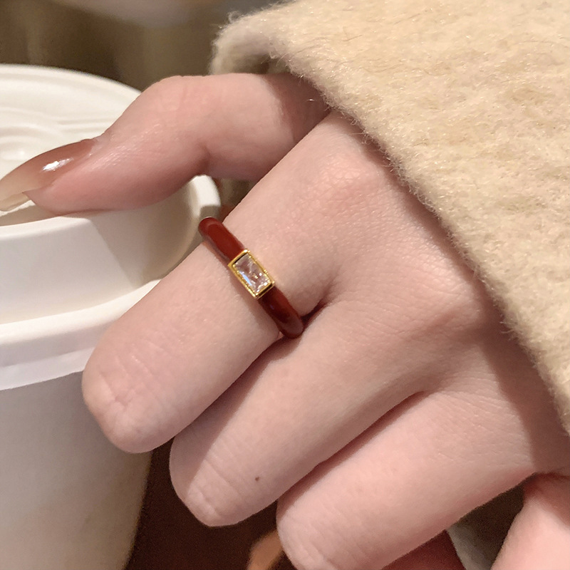 Oil Dropping Rectangular Zircon Open Ring French Elegant Exquisite Finger Ring Light Luxury High-end New Style Ring for Women