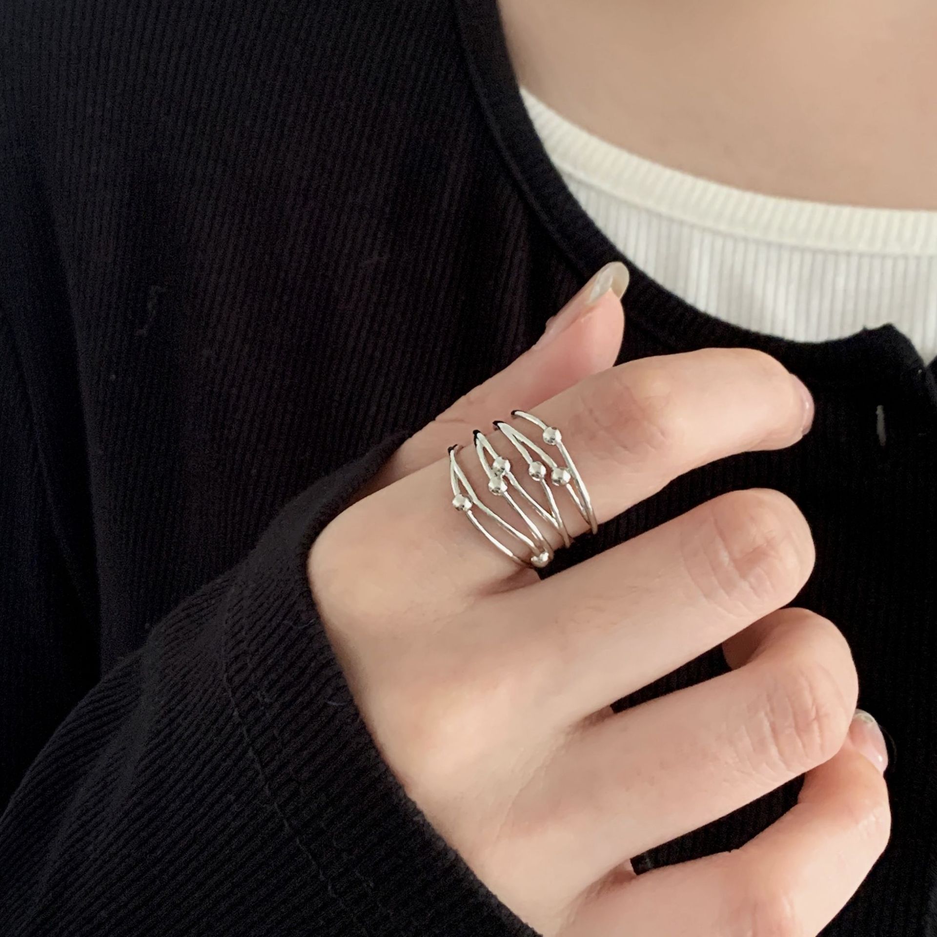 Sweet and Cool Multi-Layered Line Bead Ring for Women, High-End, Exaggerated, Unique, Fashionable Open Ring, Niche Index Finger Ring, Trendy