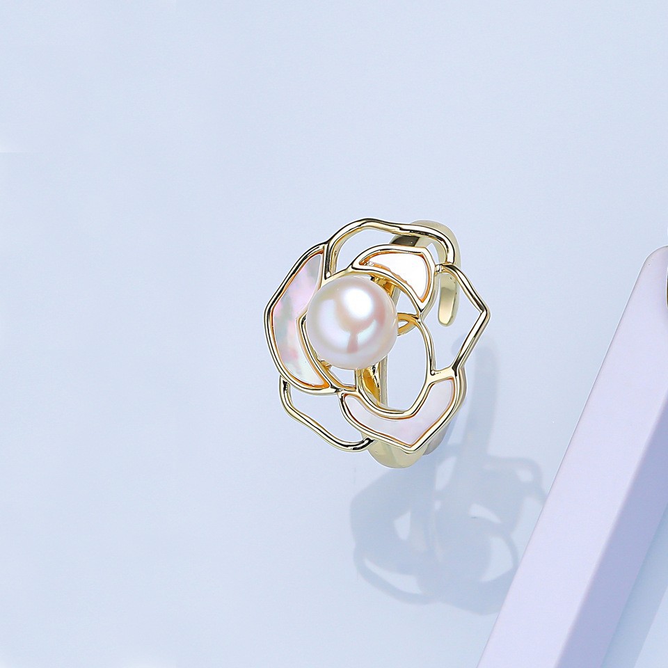 Natural Freshwater Pearl Ring for Women, High-End Mother-Of-Pearl Camellia Fan-Shaped Fashion Live Mouth Adjustable Jewelry Wholesale