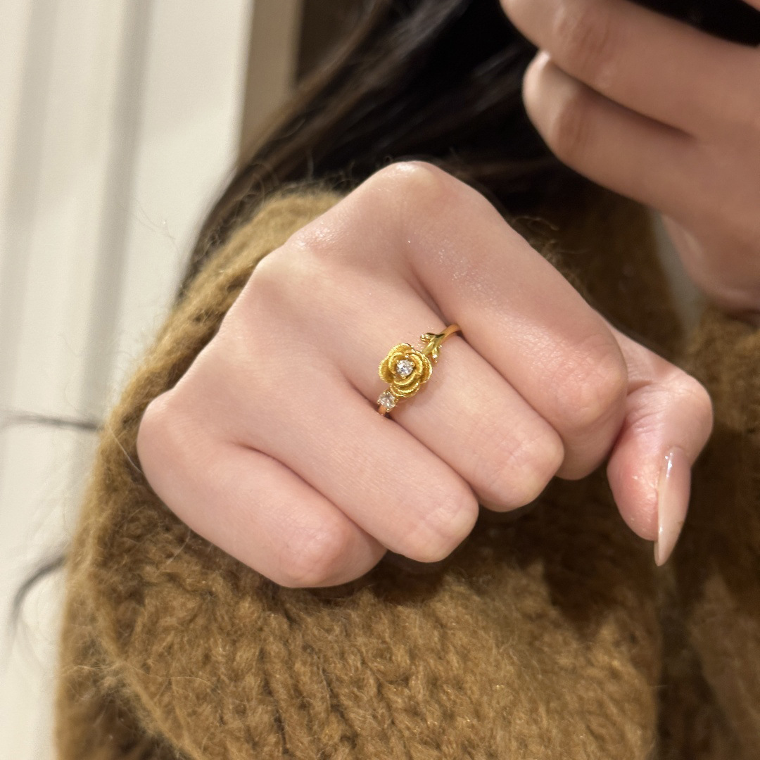 Gold brushed rose flower sparkling diamond ring women's all-match high-end retro light luxury finger ring niche ring new style