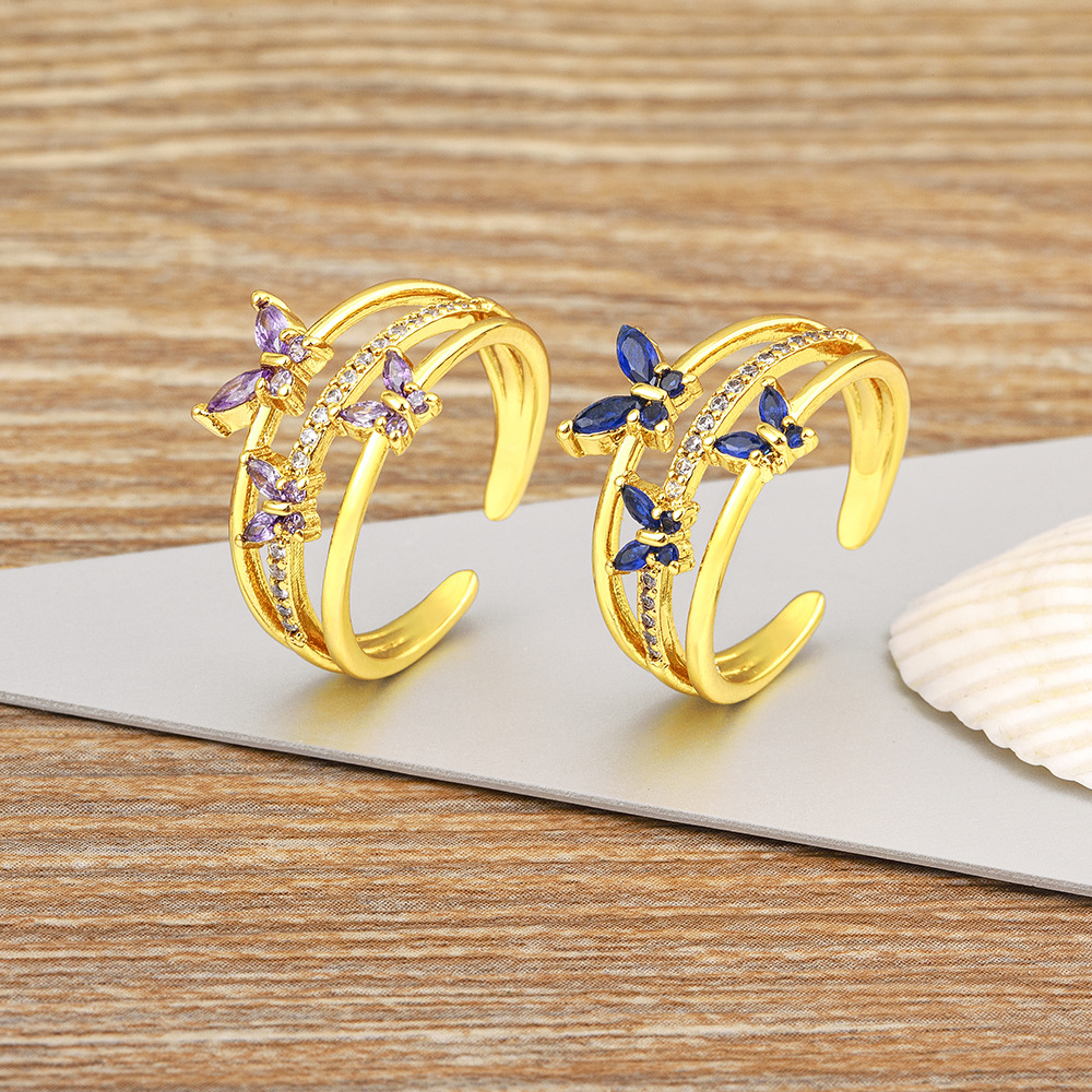 Copper Plated 18K Real Gold European and American Light Luxury Multi-layer Color Zircon Butterfly Ring Hollow Design Open Index Finger Ring