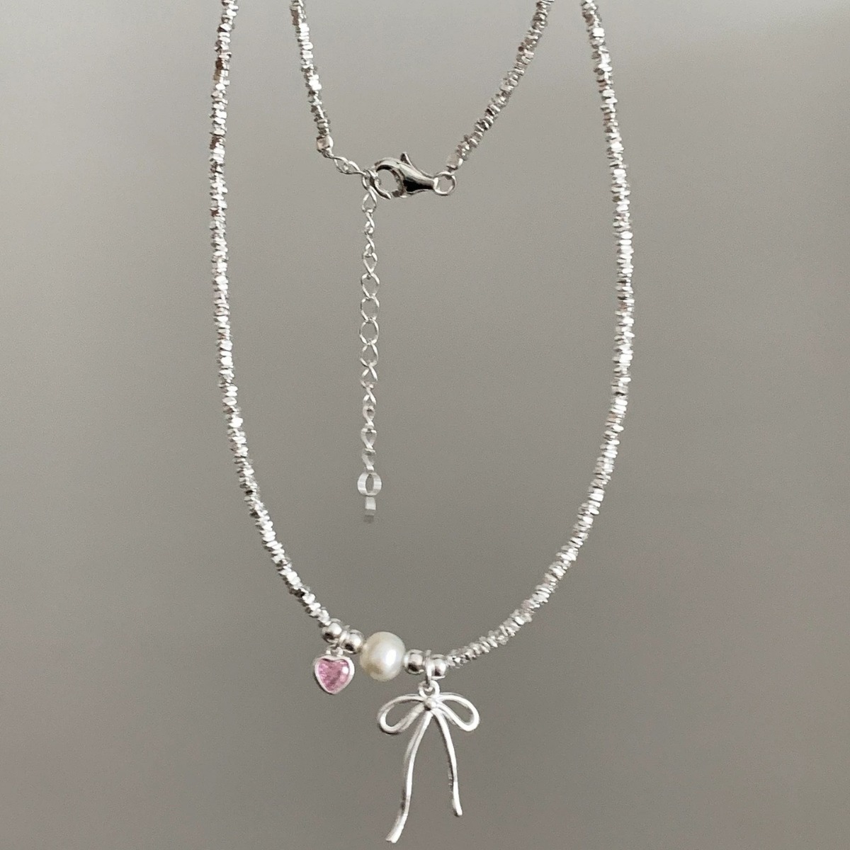 Chenxi Bow Pink Diamond Pearl Silver Necklace Accessories Women's High-end Clavicle Chain Light Luxury Niche Neck Chain