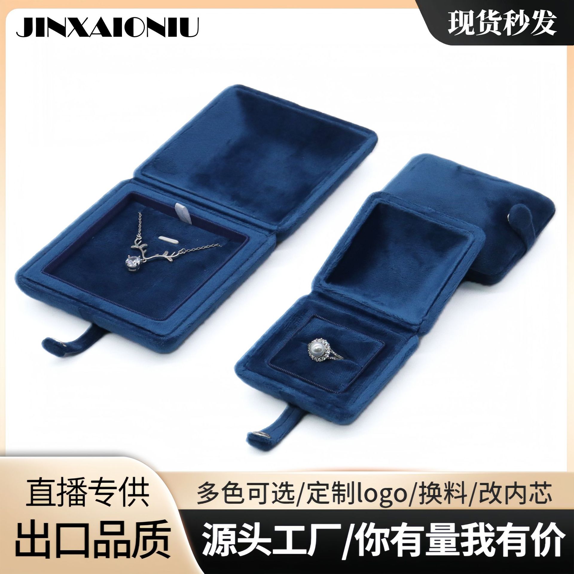 Dark Blue Velvet Ring Bracelet Pendant Box Snap-Button Velvet Pearl Necklace Box High-End Cross-Border Wholesale Customization