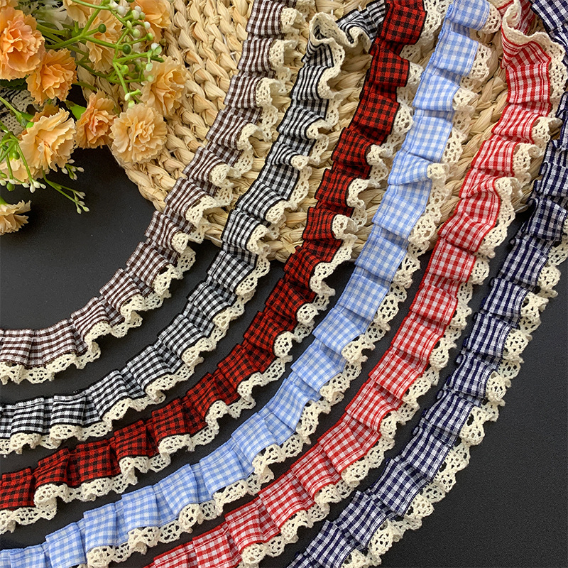 2.5cm Pleated Plaid Fabric Spliced with Cotton Lace Trim Accessories for Toys, Jewelry, Pet Clothing Decoration Materials