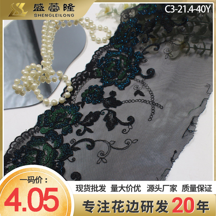 Shengleilong Black Mesh Silver Thread Dark Bright Blue Elegant Flower Embroider Lace 16.5cm Clothing Home Textile Accessories