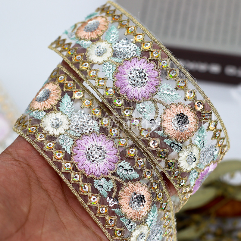 4cm Ethnic Style Embroider Lace Organza Flower Embroider Sequin Embroider Lace Clothing Accessories Accessories Wholesale