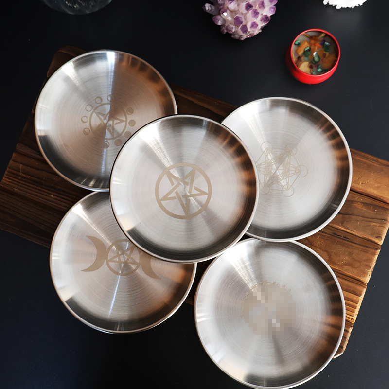 Wholesale Cross-Border Three-Phase Moon Five-Pointed Star Metal Ornament Plate Wizard Magic Candlestick Meditation Altar Stainless Steel Plate