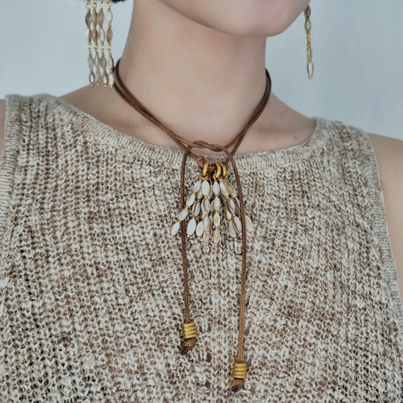 Natural Shell Tassel Beaded Pendant Wax Rope Necklace Multi-Wear Women's Accessible Luxury Niche Design Mother-Of-Pearl Tassel Earrings