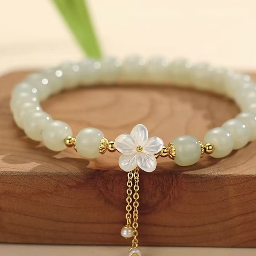New Internet Celebrant Hotan Jade Fresh Sweet Peach Flower Tassel Bracelet Women's National Style New Chinese Style Bracelet Girlfriend Gift