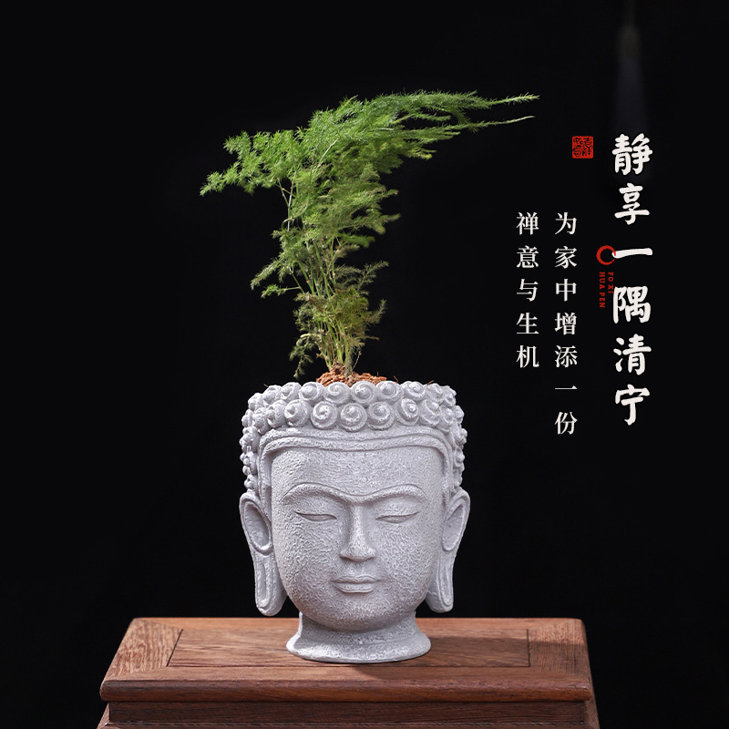 Chinese Zen Simple Imitation Stone Buddha Head Vase Gardening Landscape Landscaping Home Entrance Desktop Decorative Flower Vessel