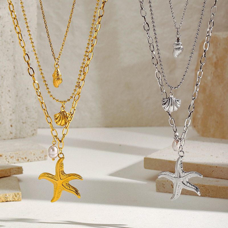 European and American Three-Layer Starfish Necklace, Personalized Long Layered Imitation Pearl Shell Titanium Steel Clavicle Chain, Fashionable Pendant Design