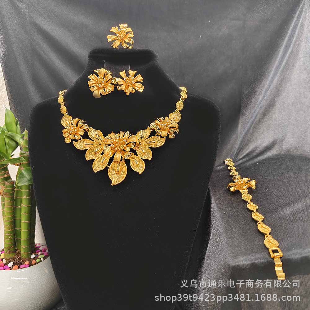 Nigeria Middle East bridal gold-plated jewelry suit flower exaggerated long necklace ring bracelet earrings four-piece set