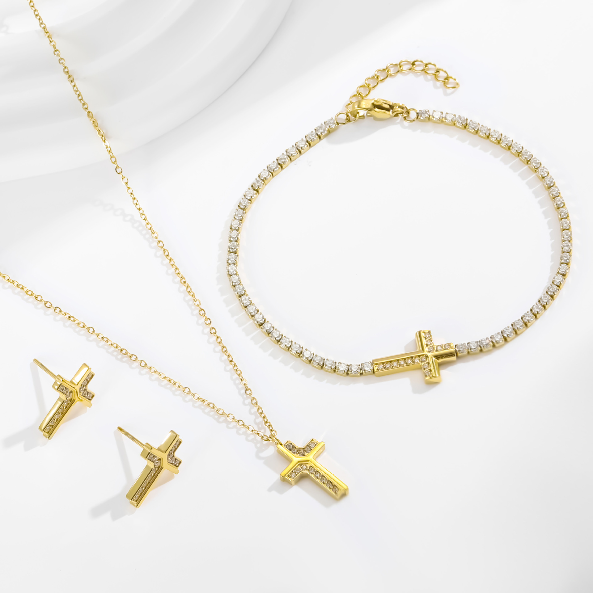 European and American light luxury cross inlaid zircon bracelet jewelry suit fashion niche stainless steel jewelry suit wholesale