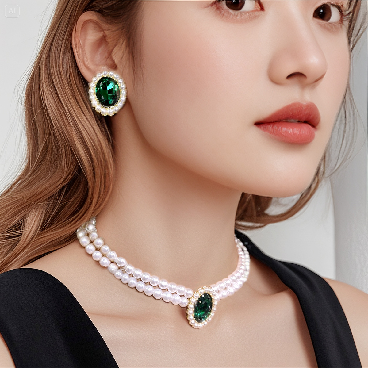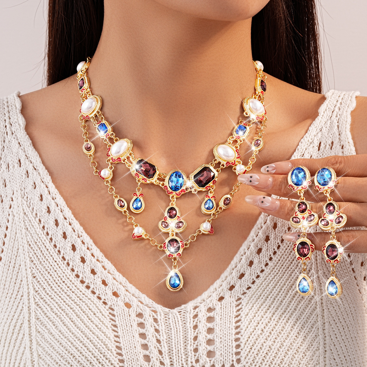 European and American Luxury Multi-Layer Imitation Pearl Geometric Crystal Necklace Earrings Green Crystal Necklace Fashionable Exaggerated Clavicle Chain