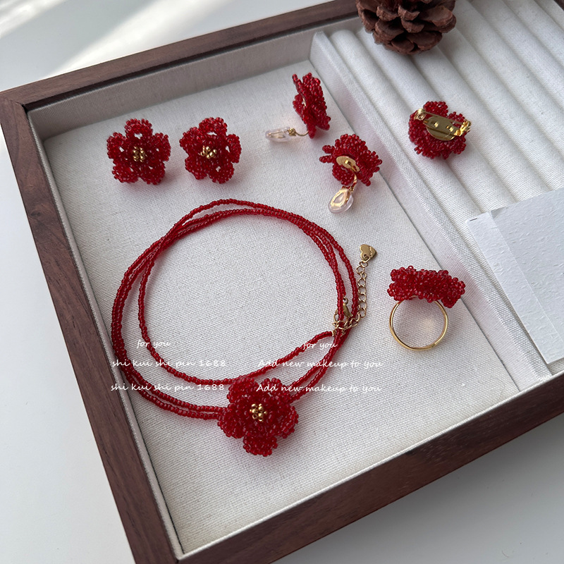 New Year's Flavor Focus Wine Red Flower Necklace Earrings Women's Jewelry Set New Year's Blessing Gifts Souvenir Good Luck Accessories