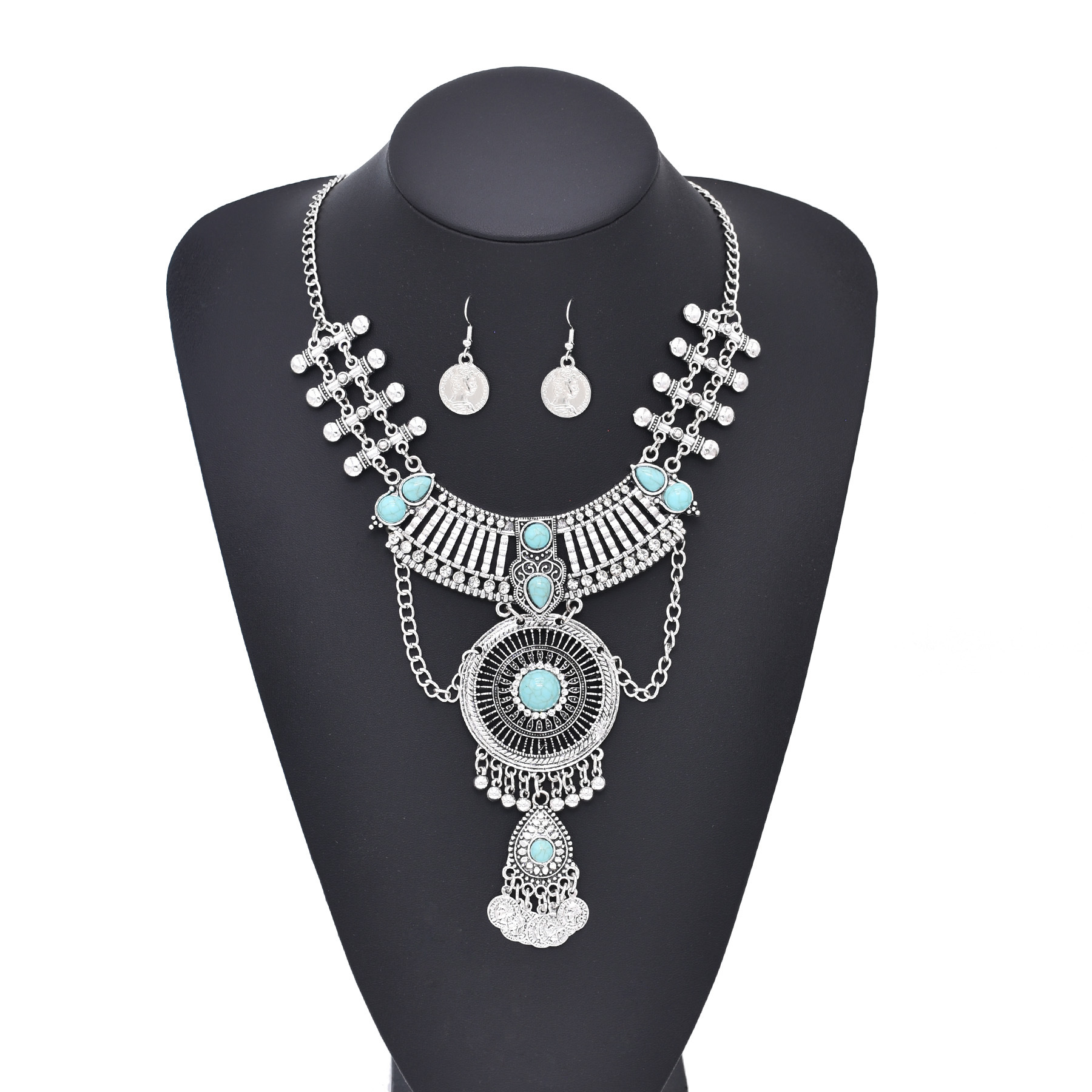 Cross-Border Jewelry Retro Blue Oval Gemstone Pendant Palace Style Necklace Earrings Bohemian Personality