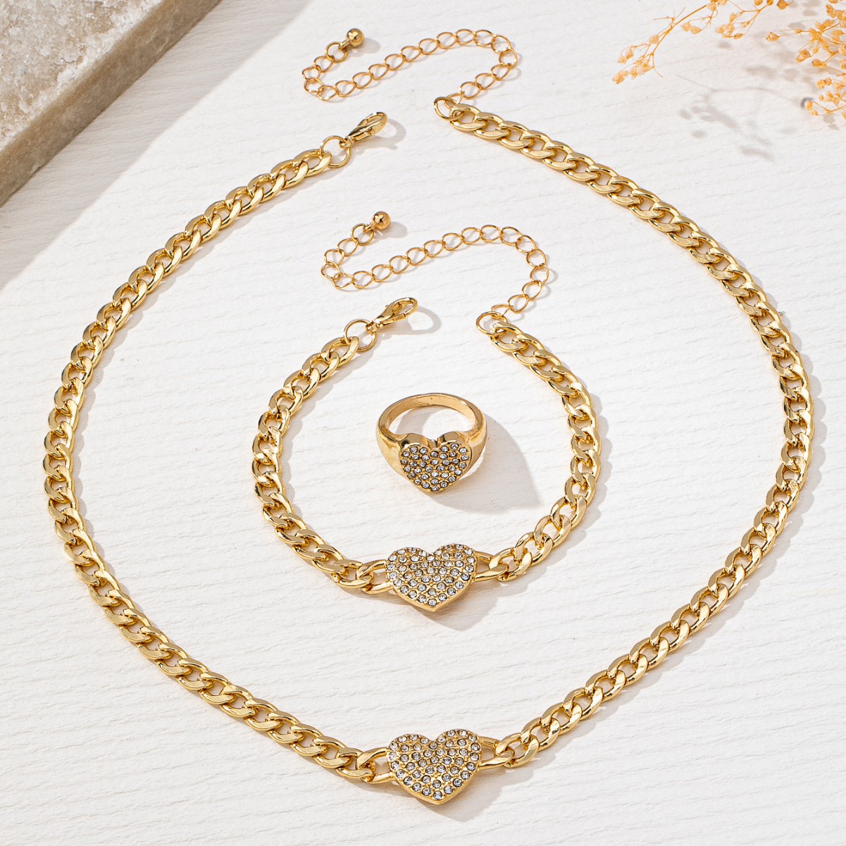 Gilt Diamond Heart Jewelry Set Cuban Chain Heart-Shaped Design Niche Sweet and Cool Style Necklace Ring Bracelet Women's Model