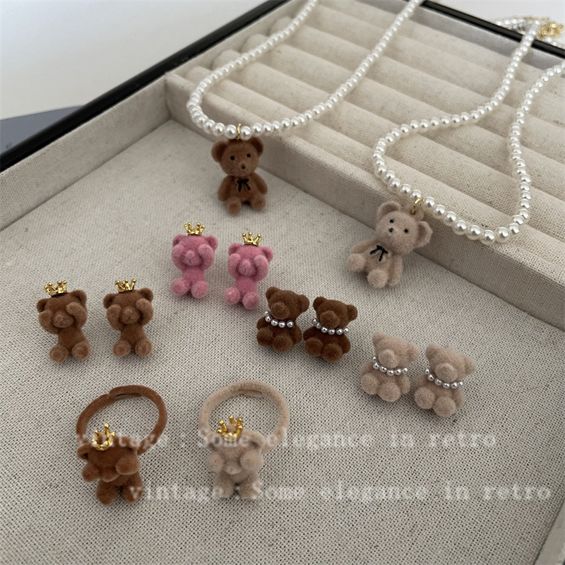 Autumn and Winter Plush Bear Series Earrings Necklace Ring Ins Retro Cute Crown Cartoon Earrings Star Same Style