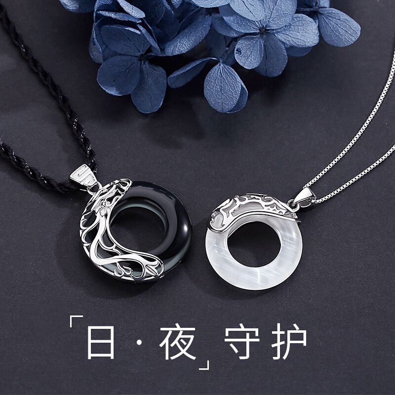 Retro Sun, Moon and Stars Couple Necklace Creative Dragon and Phoenix Chengxiang Pair of Round Black and White Glass Pendant Jewelry Gift