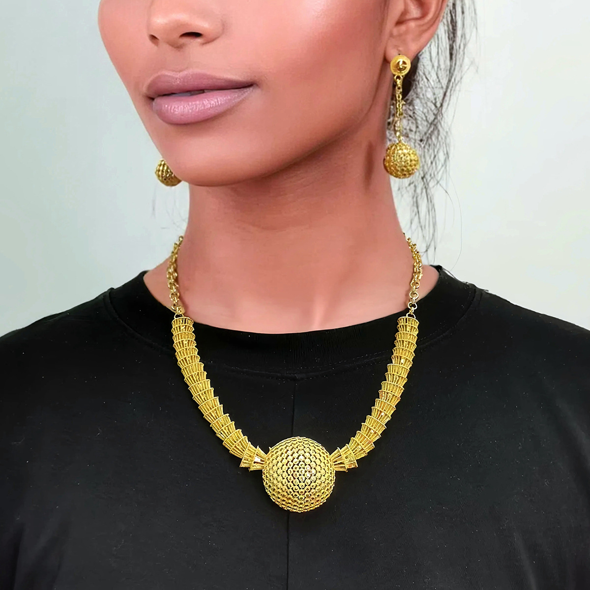 24K electroplated European and American stereo round necklace earrings suit female bridal jewelry fashion metal ball necklace collarbone