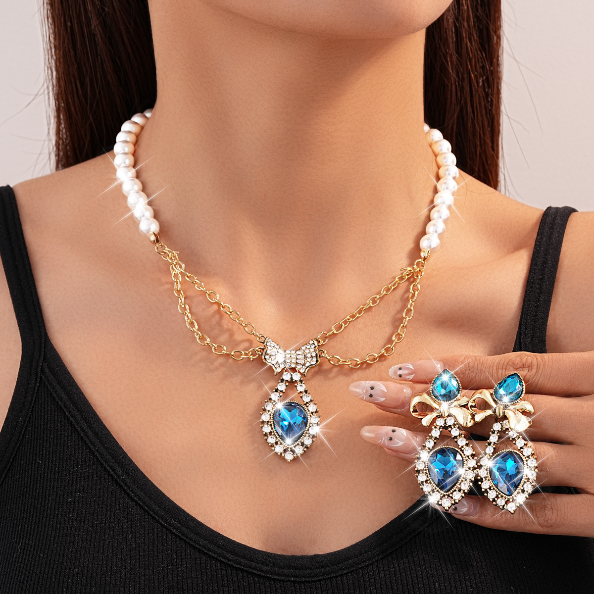 Diamond-Encrusted Pearl Bow Water Drop Earrings Necklace Set Retro Elegant Clavicle Chain Accessible Luxury High-End Necklace for Women