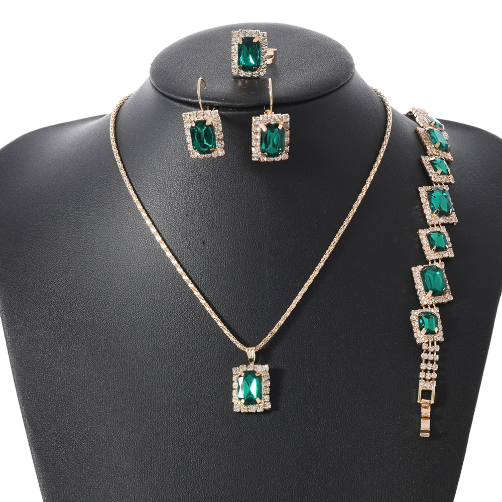 Atmospheric European and American style fashion rhinestone square green necklace three-piece set ladies Middle East cross-border hot jewelry wholesale