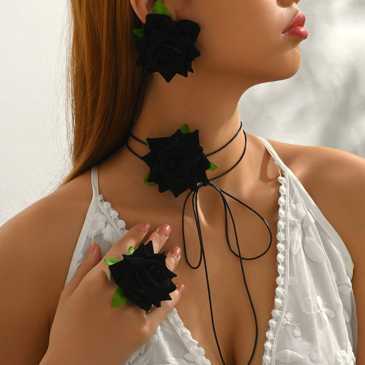 Cross-Border Temu Hot Selling Retro Rose Flower Necklace Earrings Ring Accessible Luxury Niche High-End Jewelry Set
