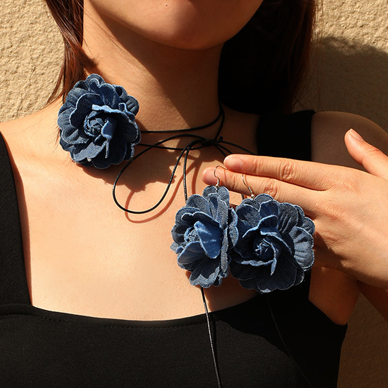 3 PC/SET Denim Flower Neck Collar Necklace 1 Flower 1 Pair Suitable for Women Daily Wear