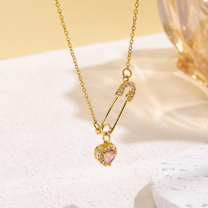 Love Diamond Pin Necklace for Women, Sweet and Cool Style, Niche, High-End, Sweet and Super Flash Clavicle Chain, Pink Water Drop