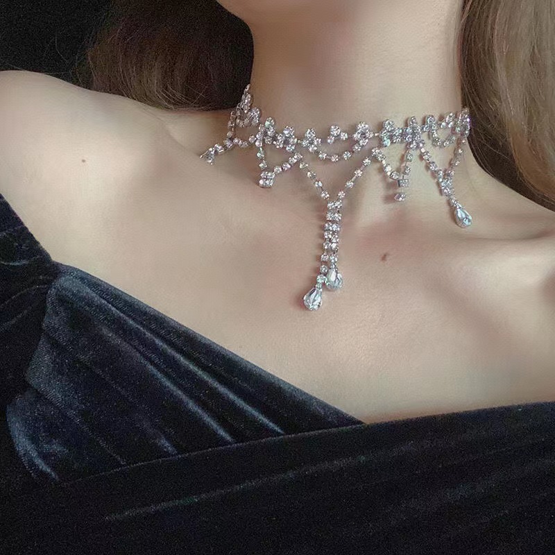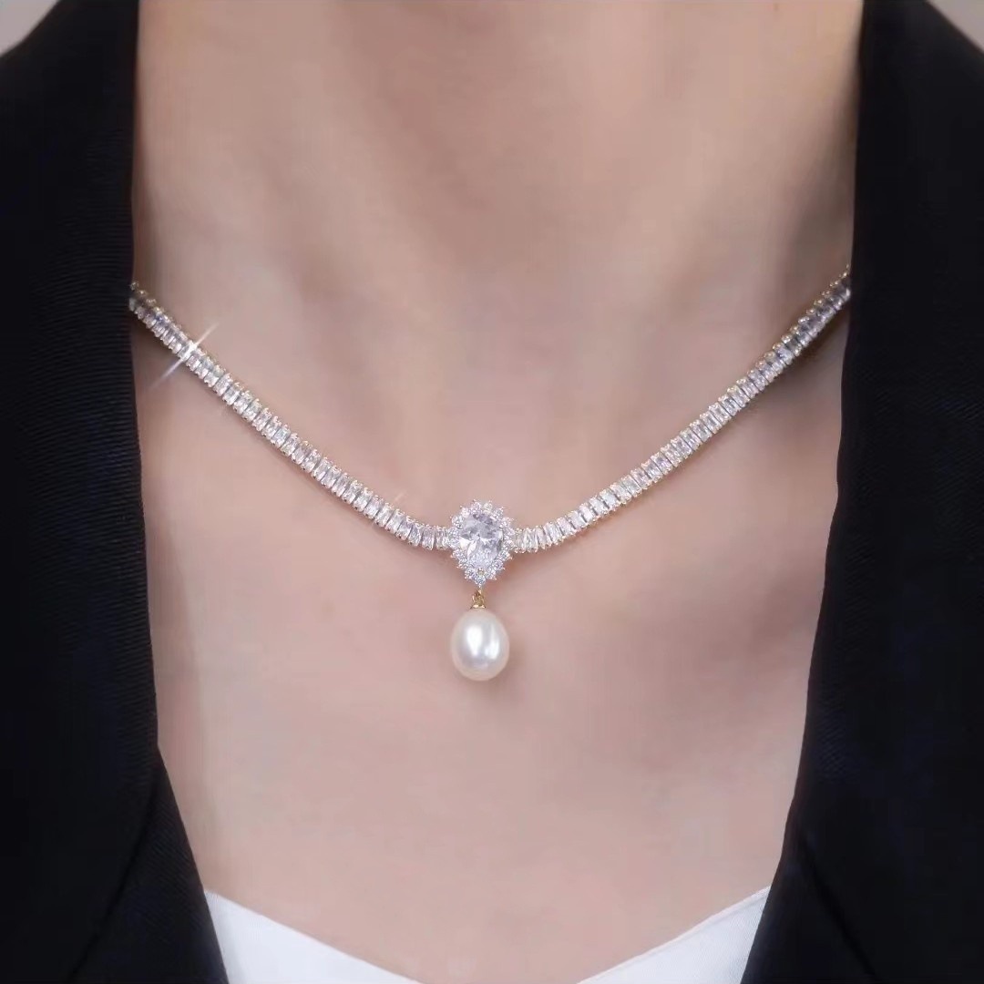 TikTok Same Style Elegant Luxury Full Zirconium Water Drop Pearl Necklace Niche Design Sweet Cool Cold Internet Celebrity Sweater Chain