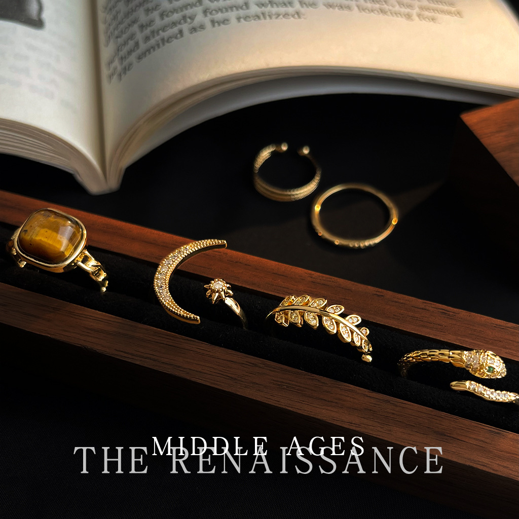 vintage Middle Ancient Style Star Moon Zircon Ring Geometric Tiger Eye Stone Finger Ring Niche Advanced Sense Open Ring for Women