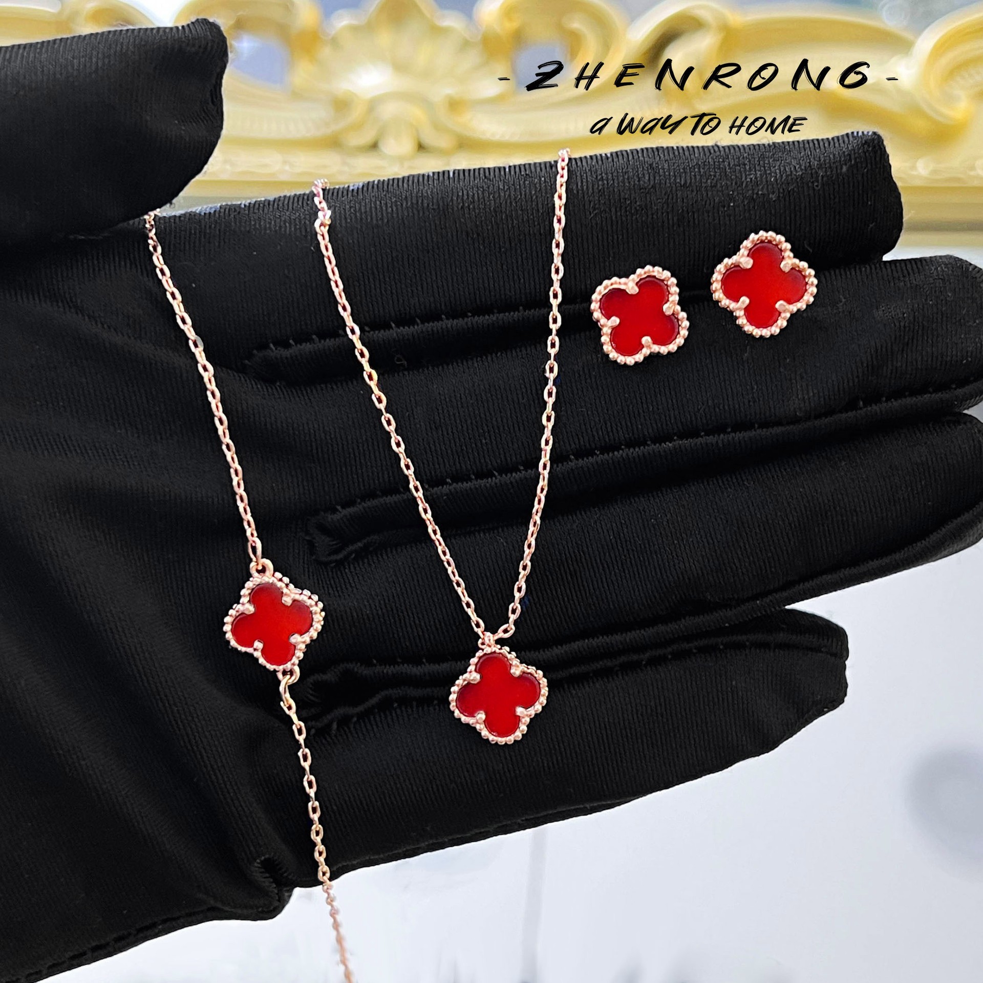 New Chinese Style small size Red Agate Four-leaf Clover Necklace Clavicle Chain Light Luxury Mini Edition Safflower Chalcedony Earrings Bracelet for Women