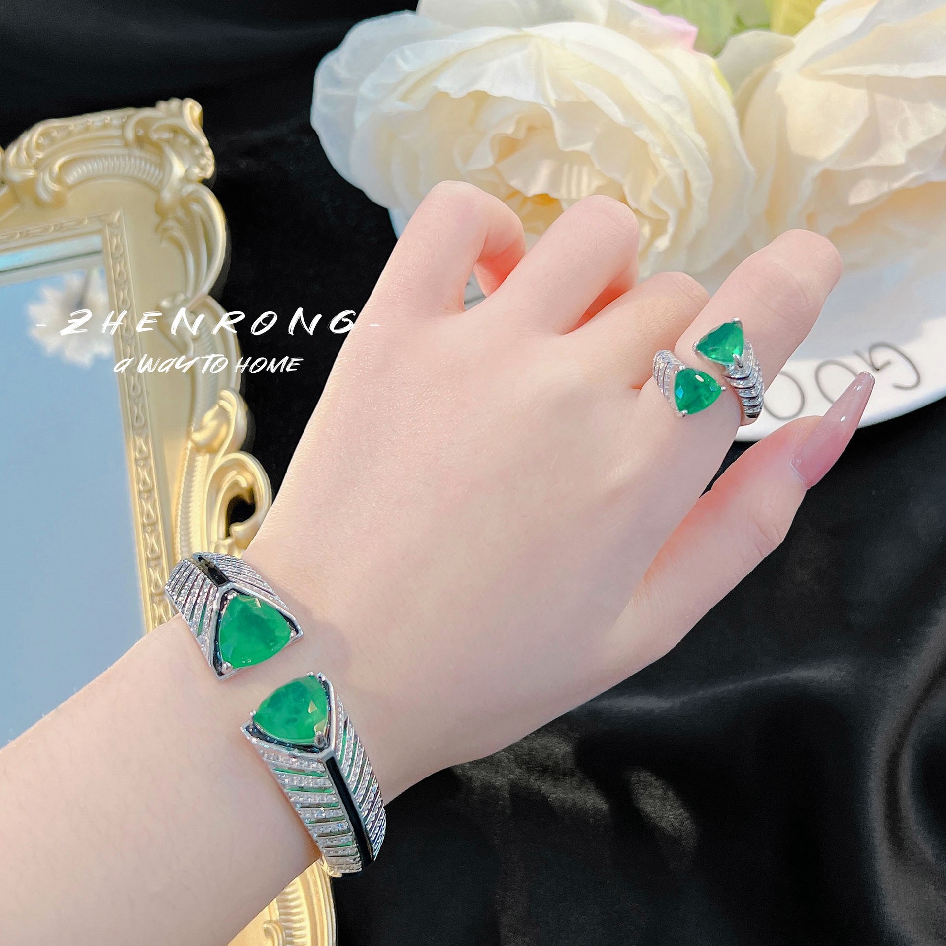 Shake Voice Live High-set Jewelry Design Emerald Necklace Square Diamond suit Color Treasure Ring Earring Set Chain