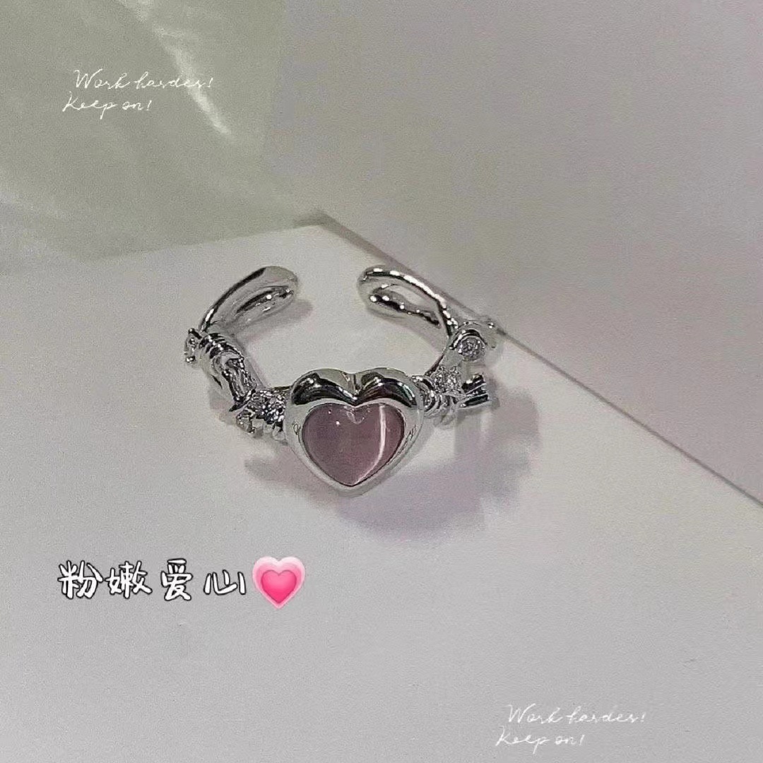 Niche Design Pink Heart Thorn Imitation Cat Eye Zircon Ring for Women Sweet and Cool Style Fashionable Elegant Versatile Ring