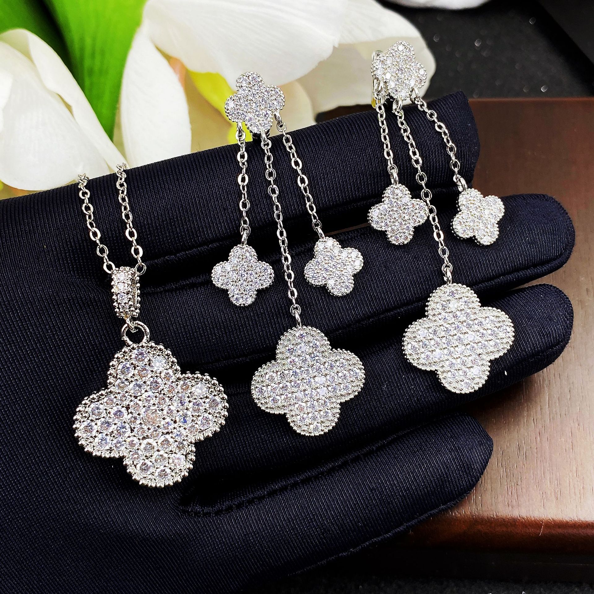 Light Luxury Full Diamond Four-leaf Flower Necklace Pendant Long Chain Elegant Super Fairy Earrings Ear Studs Small Chanel Style Bracelet Jewelry